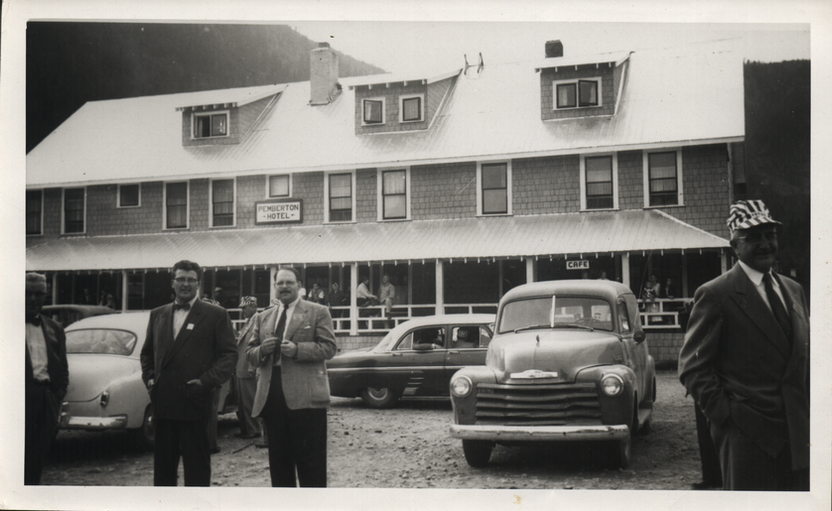 About 1914, when the Pacific Great Eastern station had been located near the existing station site, Bob McLauchlan built the shell of the original section of the present Pemberton Hotel. This fair-sized shell of a building had no partitions, and only a potbellied stove to keep it warm. Later on in the 1940’s, a lean to addition which served as the men’s section of the beer parlour, and a large storage shed built in 1948. the owner’s family lived in the upper rooms of the hotel, dined in the kitchen and used the lobby as a living room. Some of the bedrooms had running water, but the only bathrooms were on the main floor, and used by the customers during open hours. The bar parlour was divided into “men only” and “ladies and escorts”. On busy nights the tables from the mixed side overflowed into the men’s section; on Friday pay night often the reverse. On weekday afternoons the place was so quiet.